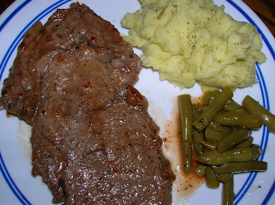 We are leaving Rome on July 17 (yay!). We've already started planning and preparing. One of our preparations is to eat all the food in our apartment. It takes longer than you think to eat all the cans of soup and beans and to eat all the frozen food. So, in an attempt to eat everything we picked some meat out of the freezer last night. Tonight's dinner was steak (marinated in Italian Roasted Red Pepper dressing with Parmesan), mashed potatoes, and green beans (also with the Red Pepper dressing). It was so tasty and it was also very delicious looking so I had to take pictures. It was a very good dinner!